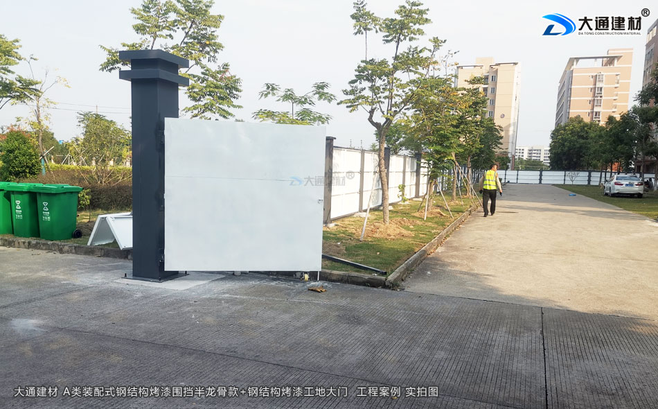 深圳市大通建材 A類烤漆鋼圍擋2米高半龍骨款與烤漆鋼結構工地大門 應用到惠州項目工程 圍擋案例實拍圖如下