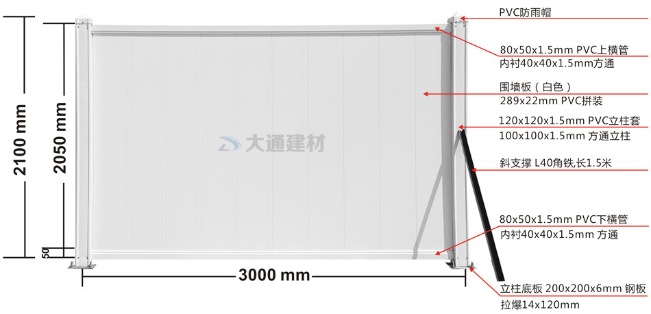 大通建材新型平面墻板PVC圍擋快速安裝、標準化快速拼裝:立柱(立柱底板)、上下橫管、斜支撐和橫撐加強筋等部件尺寸與工藝實現標準化生產和標準化拼接安裝,從而達到高效率生產、快速運輸和拼接式安裝,大大降低了圍擋的采購成本。