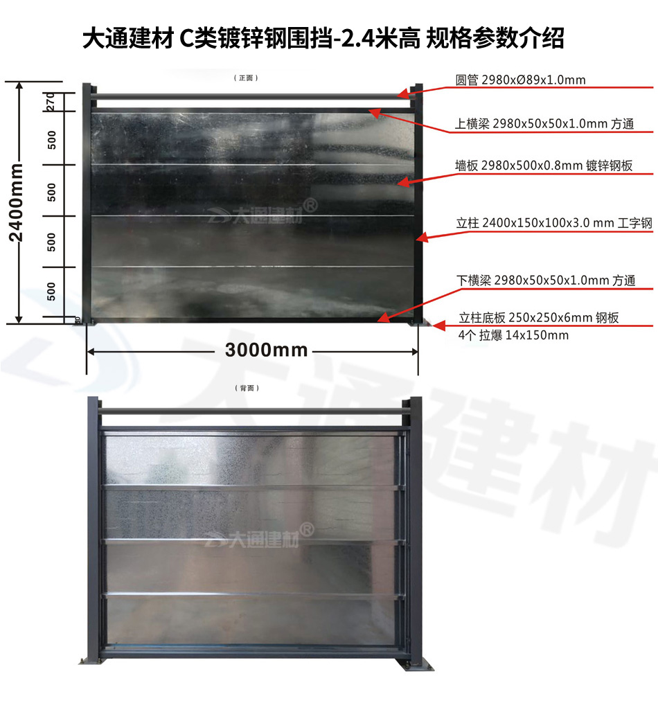 深圳大通建材C類裝配式鋼圍擋-鍍鋅板款通常作為圍墻護欄使用,起隔離防護作用。常規一擋的長度是3米、高度是2.4米和2.5米,若沒有特殊要求的項目工程按性價比來選擇鍍鋅鋼板圍擋款式建議是選擇鍍鋅鋼板圍擋c款的2.4米高的工字鋼立柱的普通款。如果對高度要求至少要2.5米高的工程,這種情況下建議使用H型鋼立柱鍍鋅鋼板圍擋c款。